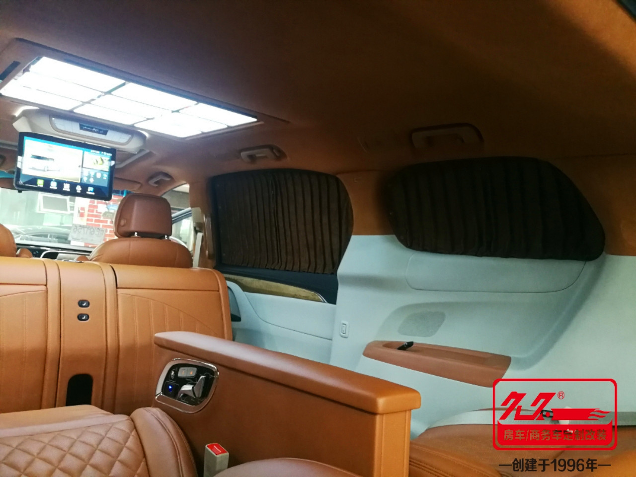 頂蓬麂皮絨包覆,局部拉手蓋闆同色處理;頂蓬專用九宮格燈;15.6寸安卓吸頂電視,車内休閑娛樂高清版視頻不耽誤;豪華布藝推拉窗簾,增加車内隐私,遮光性好 (hǎo),車内睡覺更放心 (xīn);在線影院